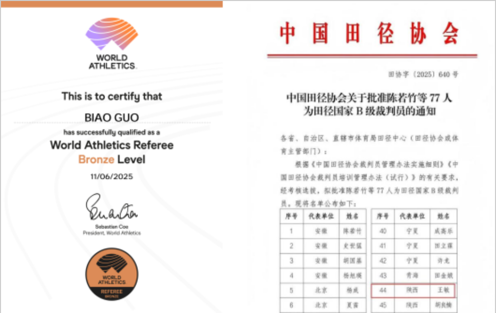 近日,经世界田径联合会与中国田径协会层层遴选与严格考评,体育部郭飙老师获世界田联(World Athletics)“国际级铜牌裁判长”资格认证;王敏老师被中国田径协会批准为“田径国家B级裁判员”。