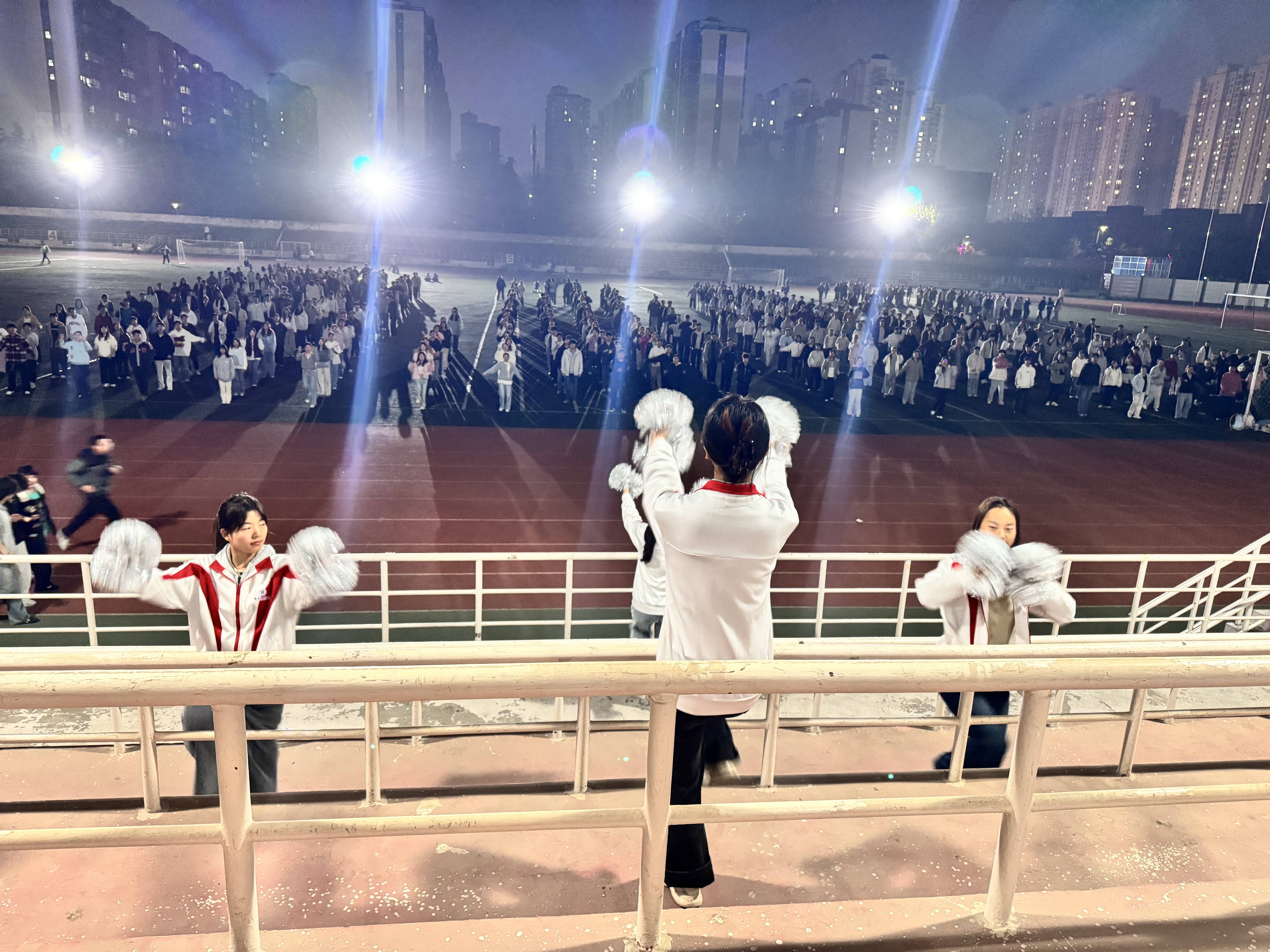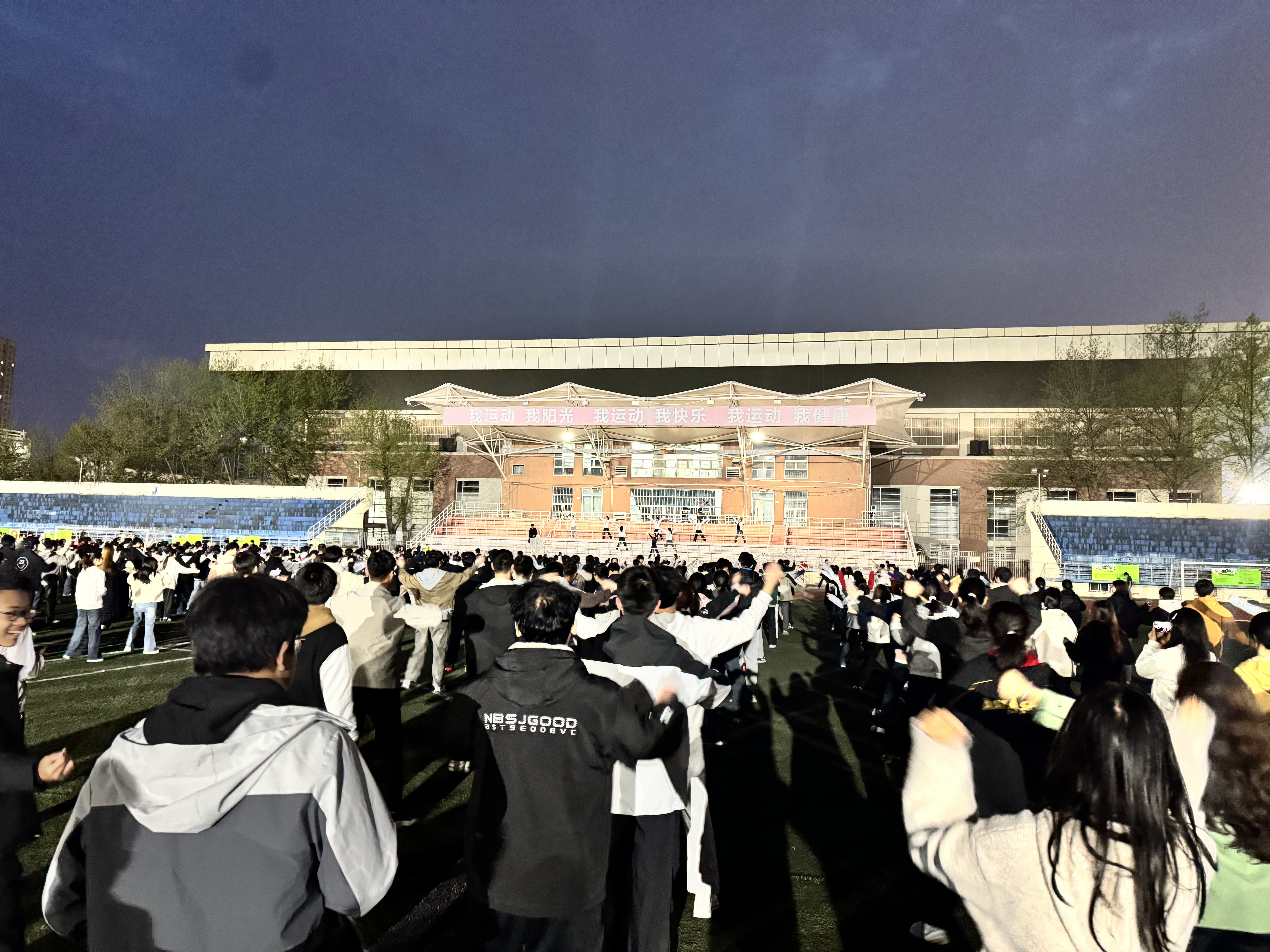 当动感十足的旋律响起,看台上的专业教师与领舞团队热情领跳,用极具感染力的动作点燃全场。操场上的同学们则踏着欢快的节拍尽情摇摆身姿。璀璨的灯光下,跃动的舞步与欢呼声交织,现场气氛被不断推向高潮。本次活动以大众喜闻乐见的舞蹈为载体,打破了常规锻炼的单调,让同学们在轻松活跃的氛围中舒展筋骨、结交同伴,真正体会到了有氧健身的纯粹与畅快。