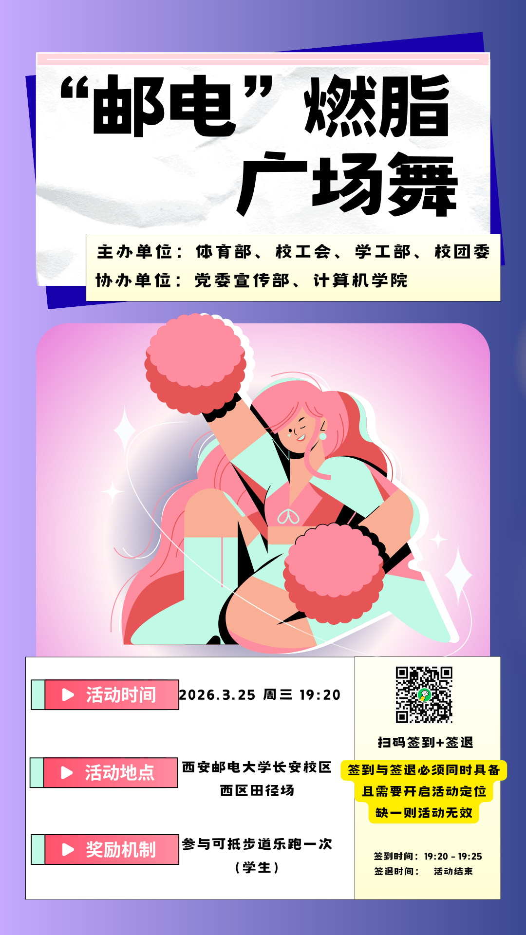 3月25日晚,由体育部、校工会、党委学生工作部、校团委联合举办的“西邮”燃脂广场舞活动在长安校区西区田径场火热开展,来自计算机等学院的600余名同学和50余名教师齐聚一堂,共同感受运动的魅力。